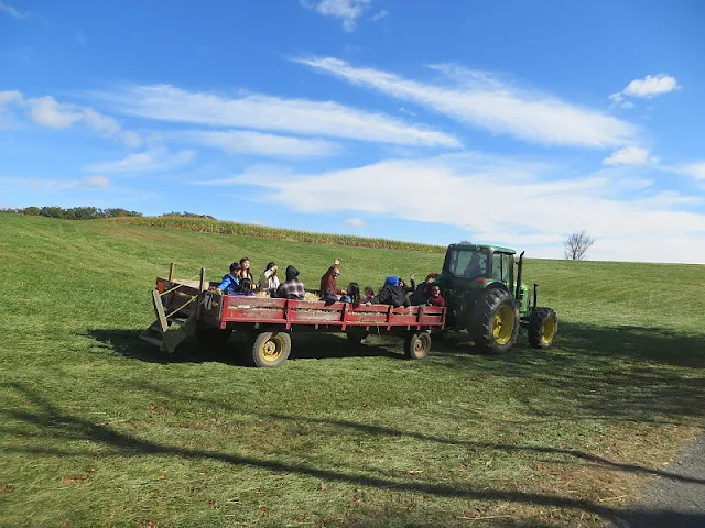 Happy October! I had a fall funday spending the day with a group of amazing local bloggers hosted by Dani. We charted a bus for the 16 of us and enjoyed mimosas on it. We visited a pumpkin patch and winery. Although it was such a windy chilly day, the sky looked so beautiful. Butler's Orchard was having their annual Pumpkin Festival which had hayrides, a corn maze, giant slides, a pumpkin cannon, pony rides, face painting, apple slingshot among many other activities. For food I was so excited to see and try their apple cider donuts! Their country store sold mums, corn, gourds, apple cider, pumpkin and apple butter, local honey, pies, caramel apples, and fresh picked apples from their orchard. I didn't get any apples because I had just gone apple picking a few weeks ago at another orchard.